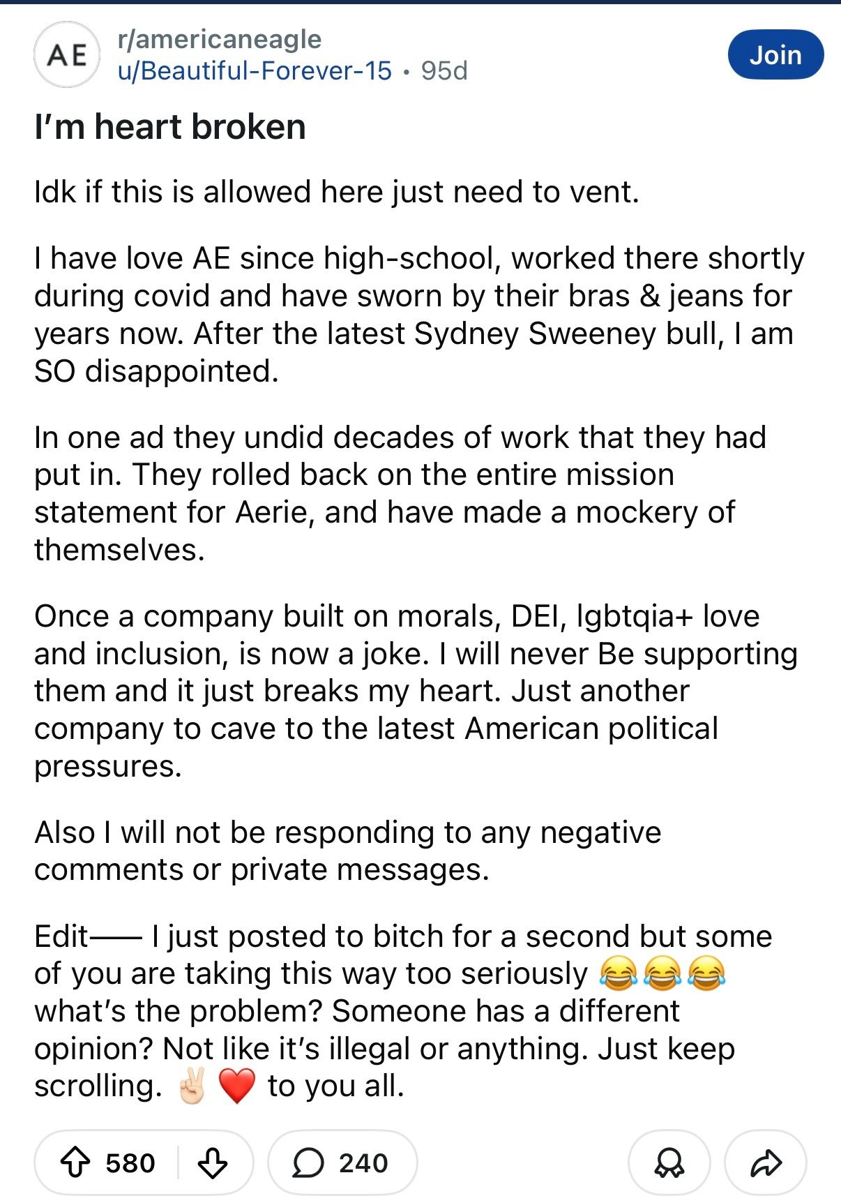 The pun on “jeans” vs. “genes” drew attention but also sparked criticism for feeling shallow and insensitive | The ad leaned heavily on Sweeney’s popularity and physical appeal without connecting to a meaningful brand story | American Eagle’s identity focuses on inclusivity and authentic self-expression and this campaign felt like it missed that mark |